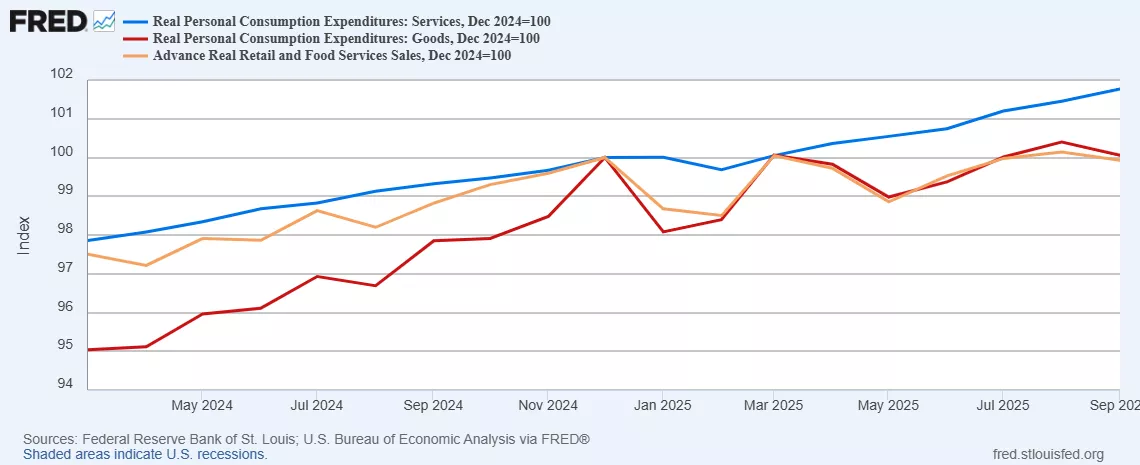 With that major drawback, here is a link to real personal consumption on goods (red), services (blue), and real retail sales (gold) through September, normed to 100 as of last December: