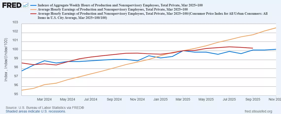 In that regard, the below link goes to a graph which shows the two components of that measure: aggregate hours worked (blue) and real average nonsupervisory hourly wages (red). Becuase there was no update for inflation for October, I also show nominal hourly wages (gold) through November. These are all normed to 100 as of March: