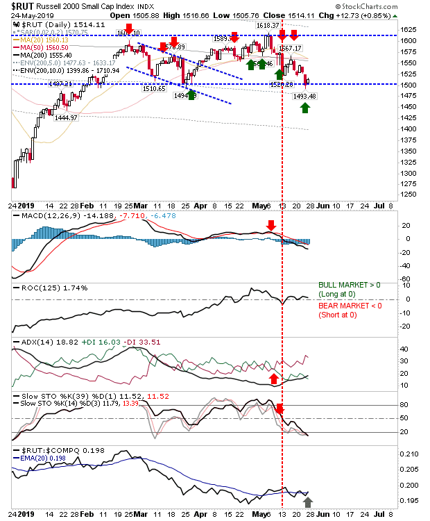 Friday was a bit of a mixed bag. The Russell 2000 was able to defend horizontal support as it continues to build a sideways pattern. While it trades sideways it will keep other indices in check until there is a confirmed directional turn - either a break of current support (for bears) or a rally back to, then beyond 1,615 resistance.