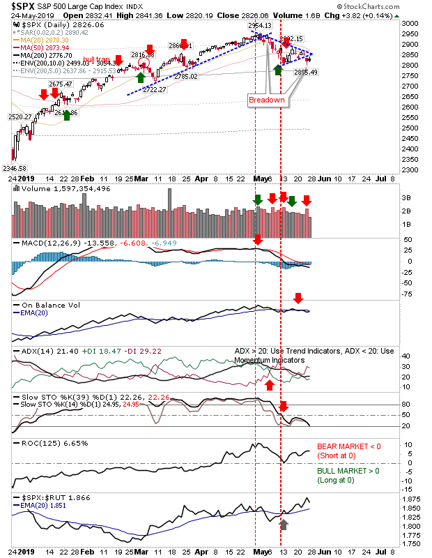 With the Russell 2000 caught inside a trading range, the breakdowns in the S&P and Nasdaq are caught in a bit of a no-mans land. As the Russell 2000 failed to break its support, both the S&P and Nasdaq are vulnerable; not just to additional losses, but also to a 'bear trap' and a rally through their respective consolidation triangles.