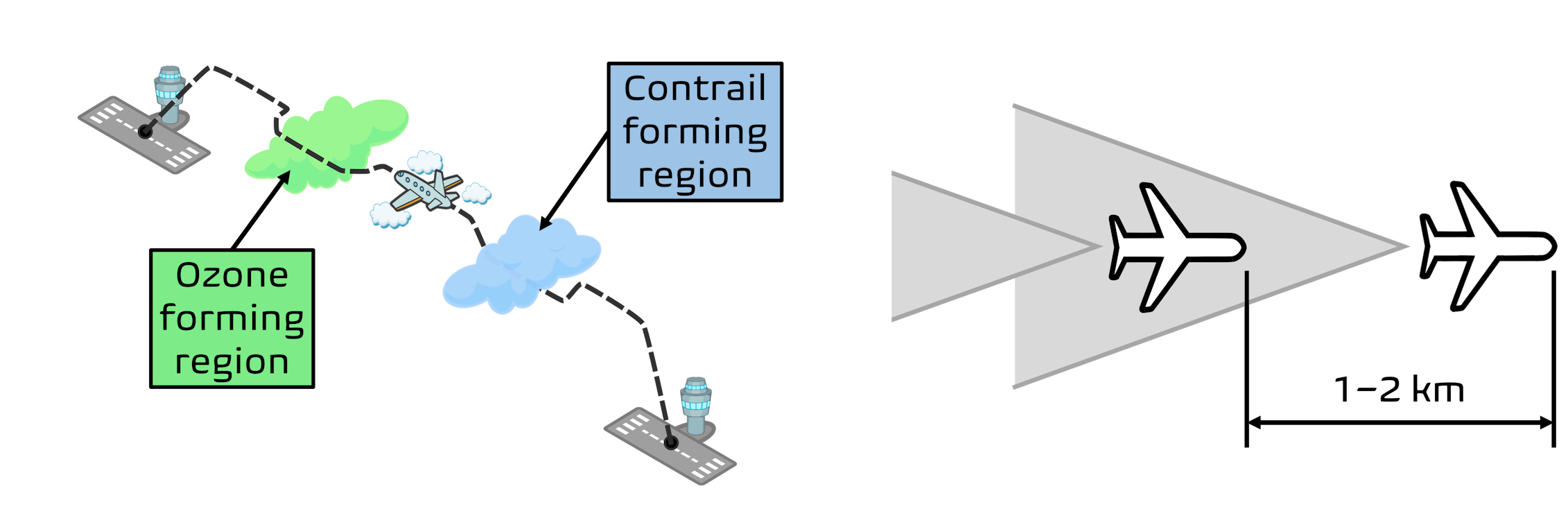 But flying in formation can reduce non-CO₂ warming too. When aircraft exhaust plumes overlap, the emissions within them accumulate. When NOₓ reaches a certain concentration, the rate of ozone production decreases and the warming effect slows.