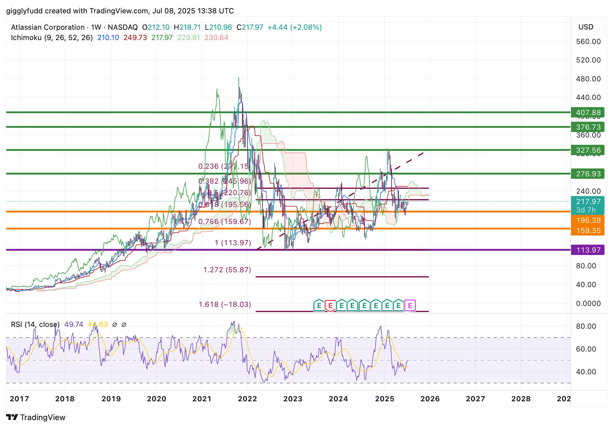Atlassian (TEAM) was in a strong uptrend until October 2021, reaching a high of 483 before entering a downward phase. Since then, the stock has been on a slow, choppy recovery.