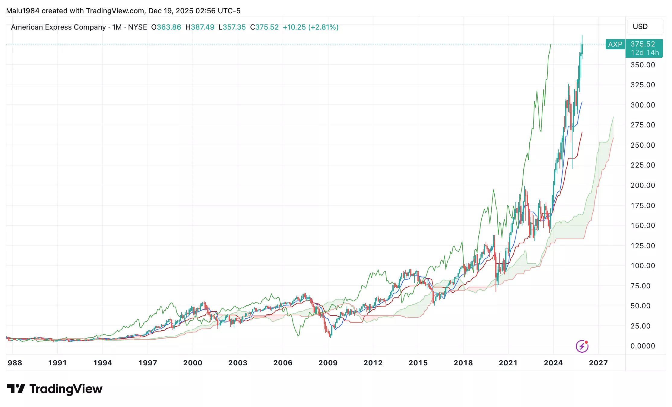 The monthly chart shows American Express trading well above the Ichimoku Cloud, which confirms a strong and established long term bullish trend. When price stays far above the cloud, it usually signals long term strength rather than short term speculation.