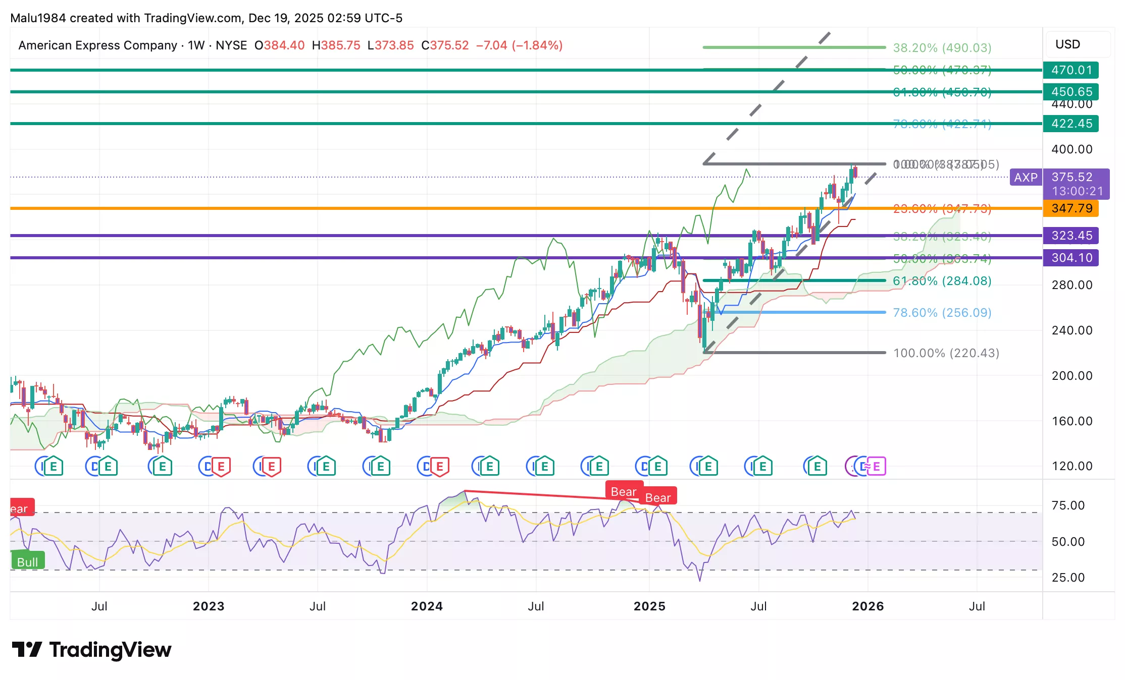 Overall, the technical outlook for American Express remains bullish across both monthly and weekly charts. The long term trend is strong, supported by bullish Ichimoku signals and healthy momentum. While short term consolidation is possible as momentum cools slightly, there are no major technical signals suggesting a trend reversal at this stage.
