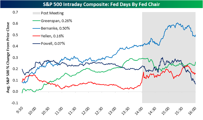 Notably, Powell has actually been the best Chair for the stock market in the first half-hour of trading on Fed Days. From there, though, the market has tended to trickle lower under Powell and then sell off sharply in the final hour of trading.