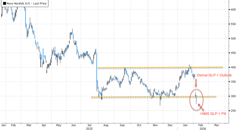 Shares dropped below the six-month base in the stock around the 300 kroner level after telehealth firm Hims & Hers Health (HIMS) rolled out a cheaper copycat version of Wegovy, delivering another blow to the beleaguered Danish drugmaker.