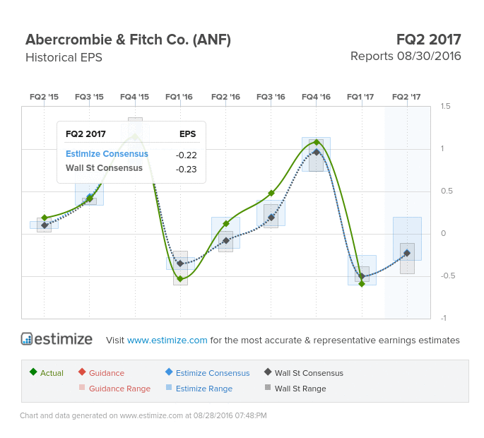 What to Watch: The retail space has seen mixed results this season, but teen retailers such as AEO and URBN have been doing remarkably well. Abercrombie is scheduled to report fiscal second quarter 20167 earnings on Tuesday morning, but unfortunately, it doesn’t look like they will continue the trend.