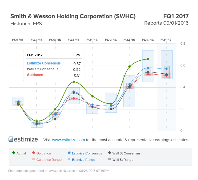Smith & Wesson (SWHC) Consumer Discretionary - Leisure Equipment & Products | Reports September 1, after the close.