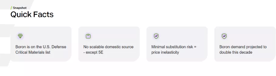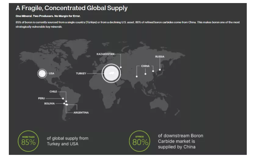 Boron production currently operates in a near-oligopoly—two entities control 85% of boron supply: Turkey's Eti Maden and Rio Tinto's (OTCMKTS: RTNTF) U.S. Borax. 60% of the total boron supply is produced by Eti Maden, which is a Turkish government entity. This means that the United States may be reliant on Turkey if it wants to expand onshore chip manufacturing or produce its own boron carbide. In fact, the Department of Defense is actively investing in domestic boron-carbide capacity, as China currently supplies 80% of boron carbide globally. For investors, that policy backdrop usually translates into faster permits, concessional funding, and strategic offtakes for credible new entrants such as 5E.