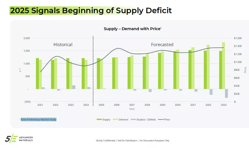 While there is competition, 5E is mainly producing boric acid, which has 1.2Mton global supply currently and is expected to increase at ~4-6% over the next decade, and it appears that modest supply will help alleviate some of that demand growth. Notably, 5E
