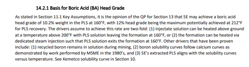 Additionally, their technical report assumes a higher head grade of boron than they are currently producing. This head grade will need to be improved to near 9.5% for the company to reach its full value. This can be achieved by heating the injected solution above ground or by injecting steam into the formation. Both options address the endpoint of the pregnant leachate solution exiting the ground at 160 degrees Fahrenheit, as increased temperature allows for higher total solubility of solute such as boron. This should be achievable, but still needs to be done and is therefore a risk.