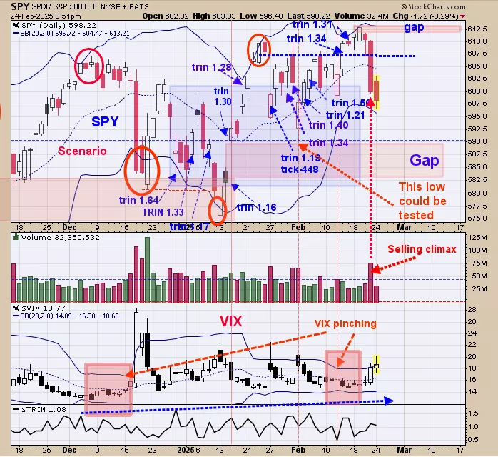 We ended up 29.28% for 2024; SPX up 23.67% for the year. Friday’s decline produced a “Selling Climax” suggesting exhaustion to the downside and that a low in the market is near by. SPY is also testing the “blue shaded area” which is where the TRIN closed in panic levels near 1.20 and higher and panic forms near lows. Seasonality leans bearish into Friday and a worth while low may form this week. There is a possibility that the gap (starting near 590 SPY) and 2/3 low may be touched (both lie near same level). Bullish signs are present; staying neutral for now.