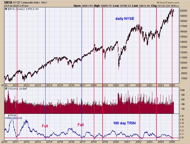 We have shown this chart in the past; it gives a big view on the bigger picture for the market. The bottom window is the 100 day average of the trin and top window is the NYA. This chart goes back to 2010 and shows the times when the 100 day TRIN reached below 1.00 (current reading is .99). Going back to 2010 the 100 day trin reached <1.00 eight times and 6 of those times (75%) the market was at an intermediate term top. Where’re getting evidences that this year may be more of a sideways pattern then a down pattern.Things may change and we will change with them. For near term we are starting to see panic in volume studies suggesting a short term low is not far off.