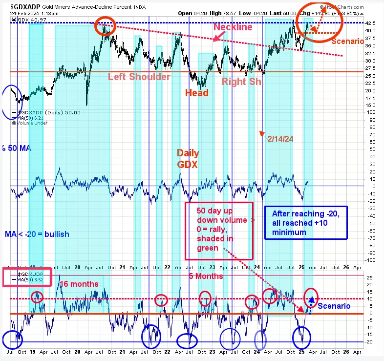 We updated this chart from last Thursday; last Thursday’s commentary still applies, “The monthly and weekly charts remain on a buy signal for GDX; short term however, a consolidation is possible (noted in previous reports). Turn your attention to the top window, which is the daily GDX going back to mid 2018. GDX is testing the highs of 2020, 2024 near the 43.00 level. Our view is that GDX may stall here for a short while before breaking through the 43.00 level. Support lies near the 39.00 level which is the previous highs and most likely an area to add. Breaking through the 43.00 area will require a “Sign of Strength” (high volume strong rally) and could be quite dramatic. The strongest part of GDX rally is in front of us.”