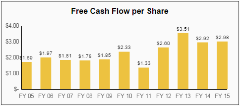 Looking at the chart below, we can see that GIS has increased its debt to capital ratio over the last decade to hit 59% in fiscal 2015. We typically prefer for companies to keep their debt to capital ratio no higher than 50%, but companies with more predictable cash flows such as GIS and other packaged food manufacturers can comfortably extend a reasonable amount beyond that mark.