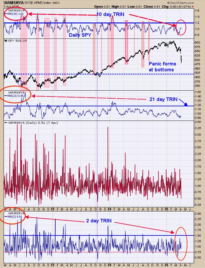 We ended up 29.28% for 2024; SPX up 23.67% for the year. Yesterday’s volume was higher today than Friday’s suggesting at some point yesterday’s low will be tested; if the test comes on lighter volume a bullish sign will be triggered. The pattern forming appears to be a “Three Gap Play”. A “Three Gap Play” is a pattern where market gaps three times in a row and the third gap ends the decline. Some times the low of the third gap is tested (may happen here) before market rallies back to test the first gap. The TRIN and tick reading intraday are showing panic which is a bullish sign. The 63, 21 and 10 day trin are not near bullish levels suggesting there may be back and filling in the market until those moving averages reach bullish levels. The TRIN closed at 2.42 and tick at -607 which is a bullish combination and buy signal; long SPX on 4/8/25 at 4982.77.