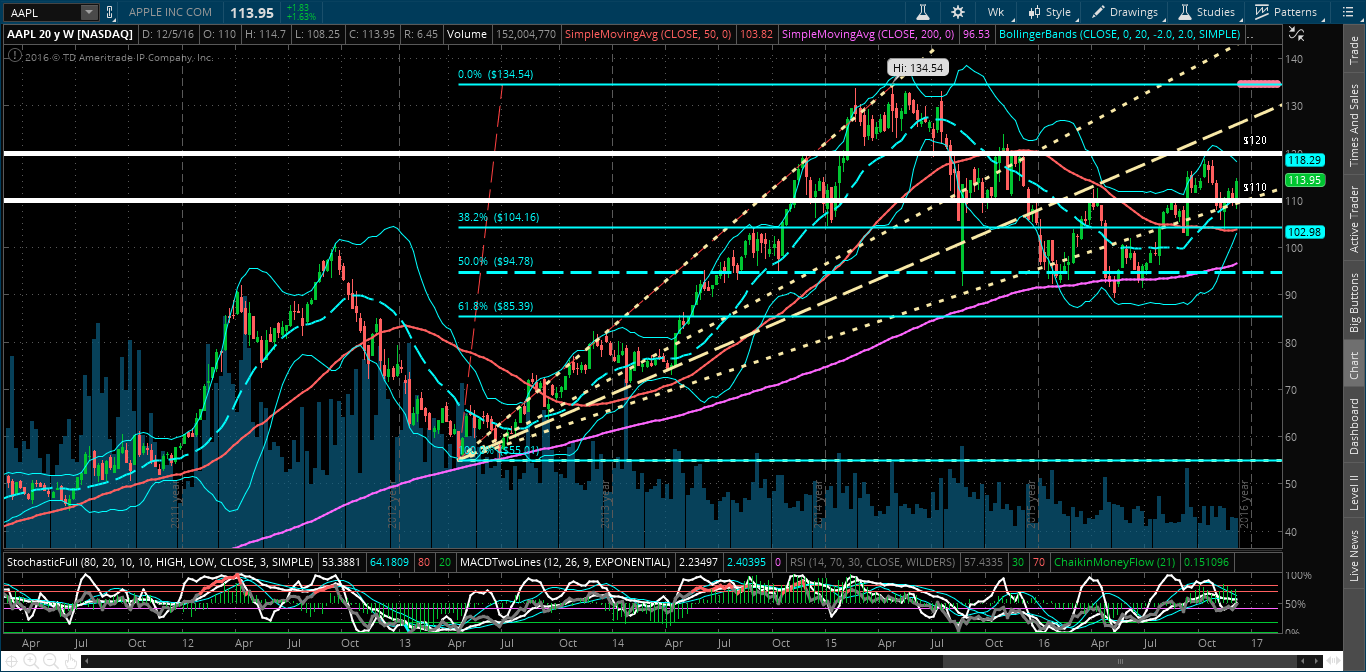 Perhaps if AAPL executives can be persuaded to repatriate its considerable overseas cash to the U.S., in exchange for forgiveness of paying taxes on such a transaction by some kind of Congressional intervention (which includes, say, AAPL committing to invest in public infrastructure programs), you could see its stock break out to new highs next year. Maybe President-elect Trump's team can work some kind of magic in this regard.