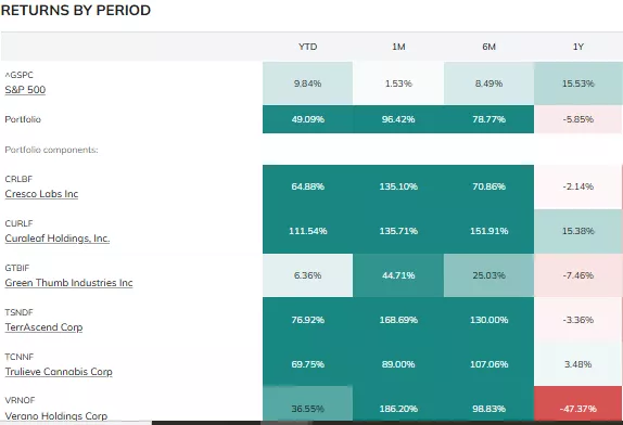 To my knowledge PortfoliosLab.com is the only site that enables an investor the ability to create a chart of the performance of a portfolio and below is a chart I created of the returns of our American Cannabis MSO Stocks Portfolio.