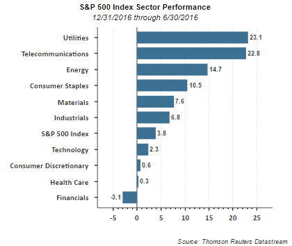 Early last week I highlighted the extended valuation of the utility sector in part due to investor demand for income yielding stocks. Not only are the income sectors attracting investor dollars, defensive sectors like consumer staples are as well. A result of this investor demand for defensive and income producing equities is these sectors have produced market beating returns so far in 2016. As the below sector return chart shows, the defensive consumer staples sector and the income yielding sectors like utilities and telecommunications have generated strong returns this year.