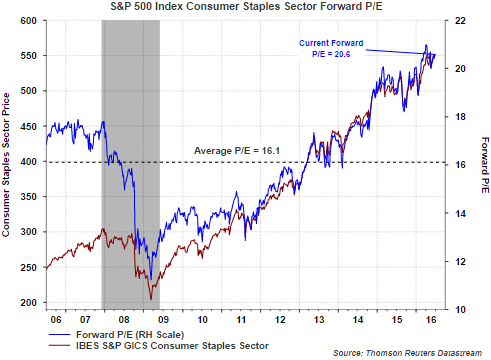 The consumer staples sector valuation is as stretch as the utility sector as can be seen in the below chart. In Q1 2016 staples did generate a small positive in earnings growth, i.e., up 1.5% versus Q1 2015. The 12-month forward earnings growth rate for the staples sector is 7.9%.