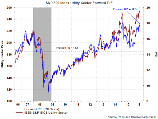 For utilities, the forward 12-month expected sector earnings growth rate is only 3.4%. In Q1 2016, although earnings were positive for the utility sector, earnings fell 4.3% as compared to the same quarter last year. Consequently, with utilities trading at a forward P/E of 17.9 times and expected earnings growth of 3.4%, this leaves little margin for error.