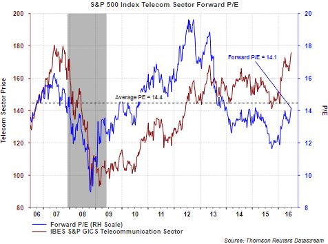 Of note is the fact the telecommunications sector is the second best performing sector this year, yet, its current valuation or P/E remains below its 10-year average.