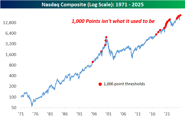 As mentioned above, 1,000 points isn’t what it used to be, and the Nasdaq’s price history on a log scale illustrates that as each 1,000-point level is more closely bunched together as the index rises over time. After requiring a rally of 100% to get from 1,000 to 2,000, it now takes a rally of less than 5% (and even less with each successive level reached) to reach a new 1,000 point threshold.