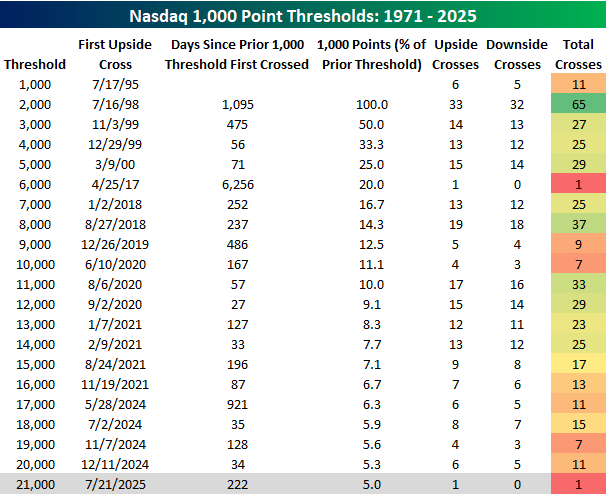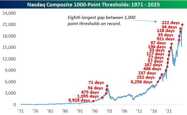 For the first time this year but the third time since the 2024 election, the Nasdaq Composite is on the cusp of closing above another 1,000-point threshold as the index crossed 21,000 for the first time earlier today. In the table below, we list the date that the Nasdaq first closed above each 1,000-point threshold since first closing above four-digit territory 30 years ago in July 1995.