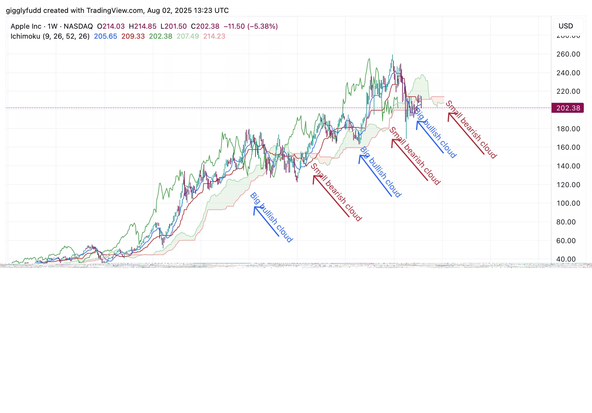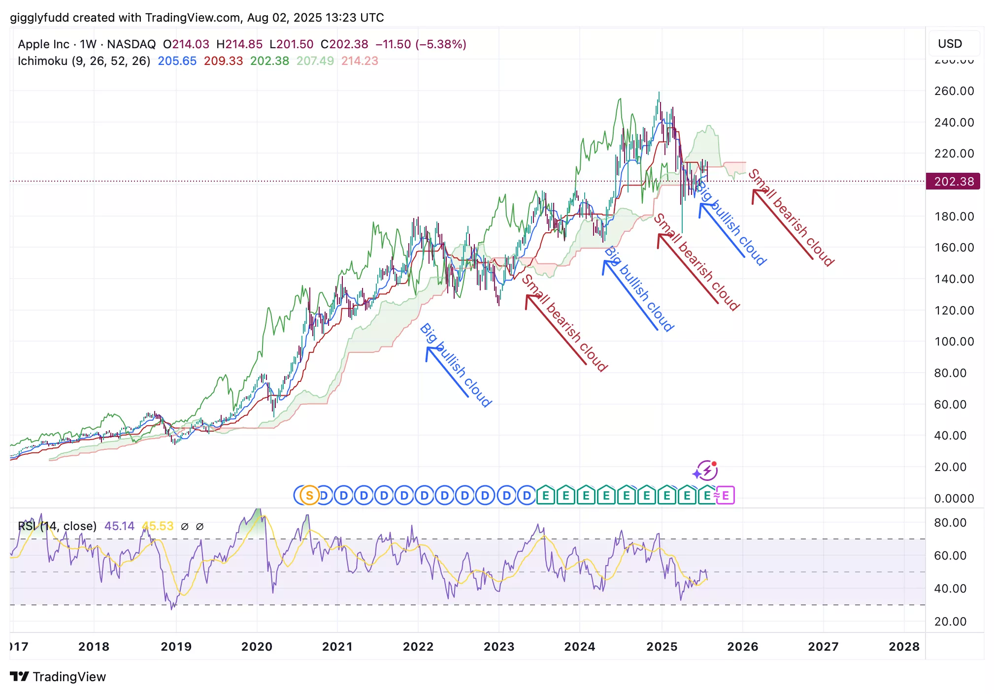 On the weekly chart, despite some choppiness, Apple has been trending upward overall. This is supported by the presence of more frequent and dominant bullish Ichimoku clouds, while the bearish clouds have been small and flat – indicating that past downtrends were short lived. Currently, the future cloud has turned bearish, and the candlesticks are positioned just below the cloud, testing it as a resistance zone. However, based on historical patterns, such bearish sentiment has typically been temporary.