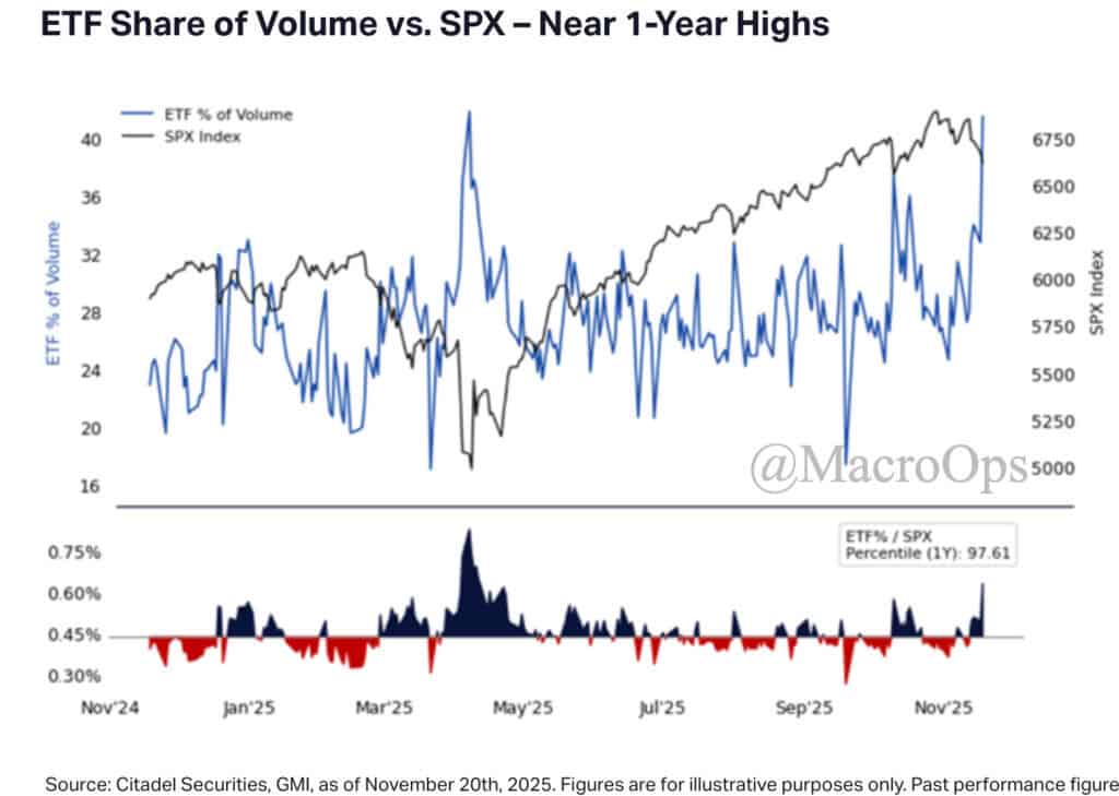 “ETF Trading given our market execution presence: On Tuesday, ETFs represented 41% of total equity volumes — well above the 28% YTD daily average and approaching levels last seen on April 7th (~42%). Elevated ETF activity suggests active hedging of both gross and net exposures. This ranks in the 98th percentile over the past 1-year.