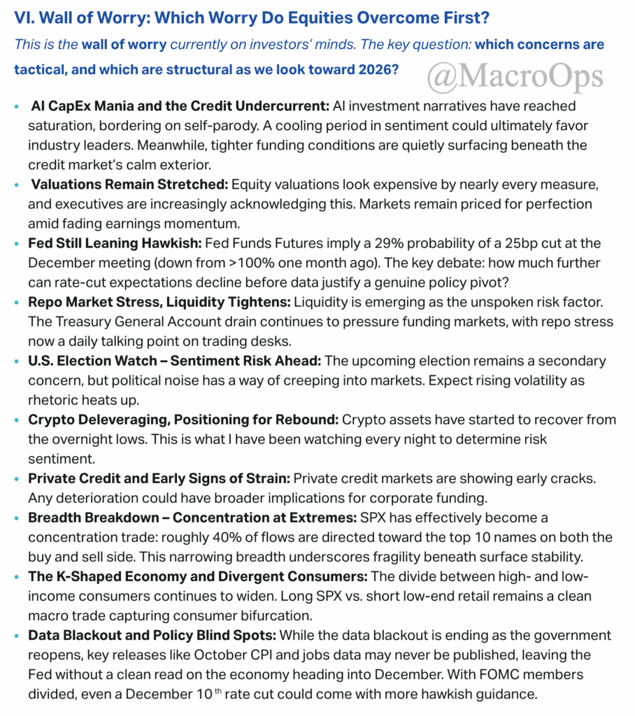5. Citadel laid out what they see as the primary concerns amongst investors today. The short- to intermediate-term picture has become increasingly muddied over the past month, in large part due to the government shutdown-induced stress in funding markets, the subsequent data blackout, and, more recently, a number of FOMC members coming out surprisingly hawkish over the past two weeks, putting a Dec rate cut in question.