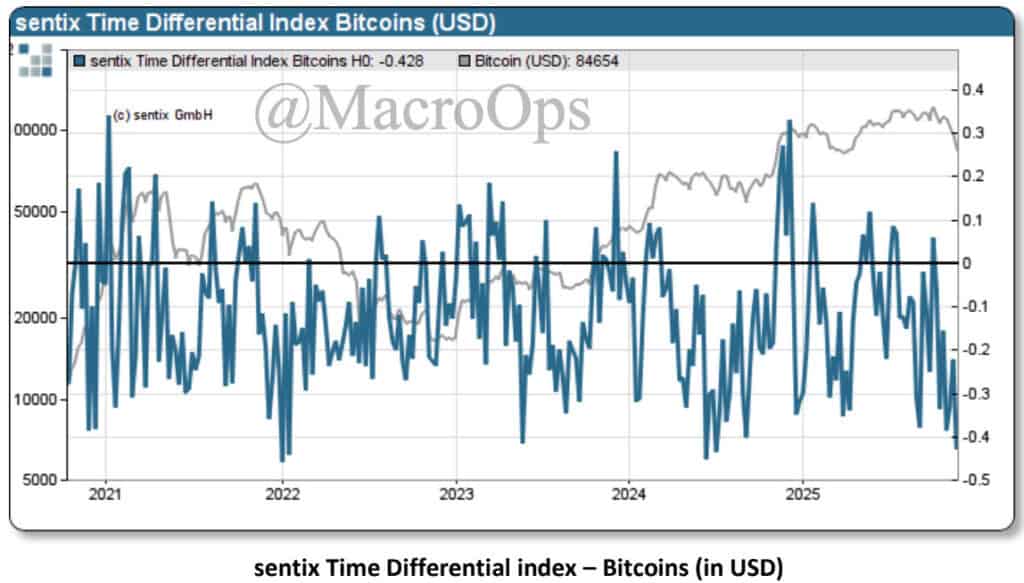 10. Sentix’s Time Differential Index for BTCUSD, which is the differential between Strategic Confidence and short-term Sentiment, has fallen to multi-year lows. Sentix notes that “sentiment is now significantly more subdued at -25 percentage points, almost as bad as it was on 25 August 2023,” which marked a major low.