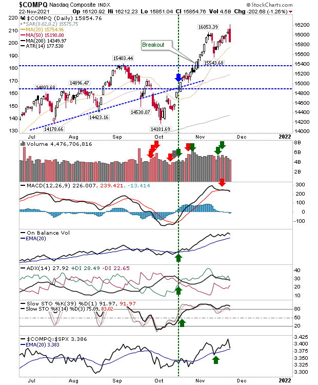 The Nasdaq is primed to retest 15,550 after failing to hold new all-time highs. Selling volume registered as distribution, but aside from the MACD 'sell', the technical picture was unchanged.