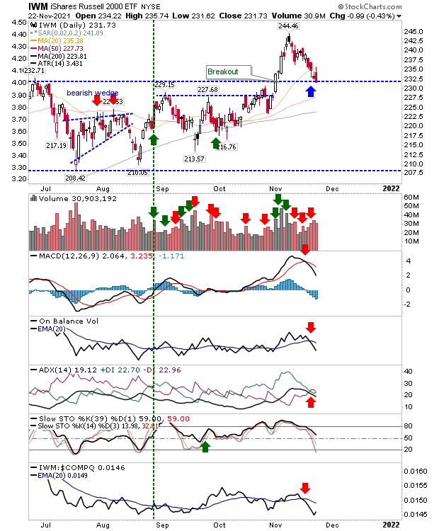 The Russell 2000 is in the process of defending breakout support, but where Friday's candlestick offered some suggestion for a successful support test, Monday's selling left the index clinging on life support. This is a very important test as the Russell 2000 has spent most of 2021 caught in a trading range. Whereas the S&P and Nasdaq have enjoyed strong gains over the year and would expect to see some downside, this is not the case for the Russell 2000.