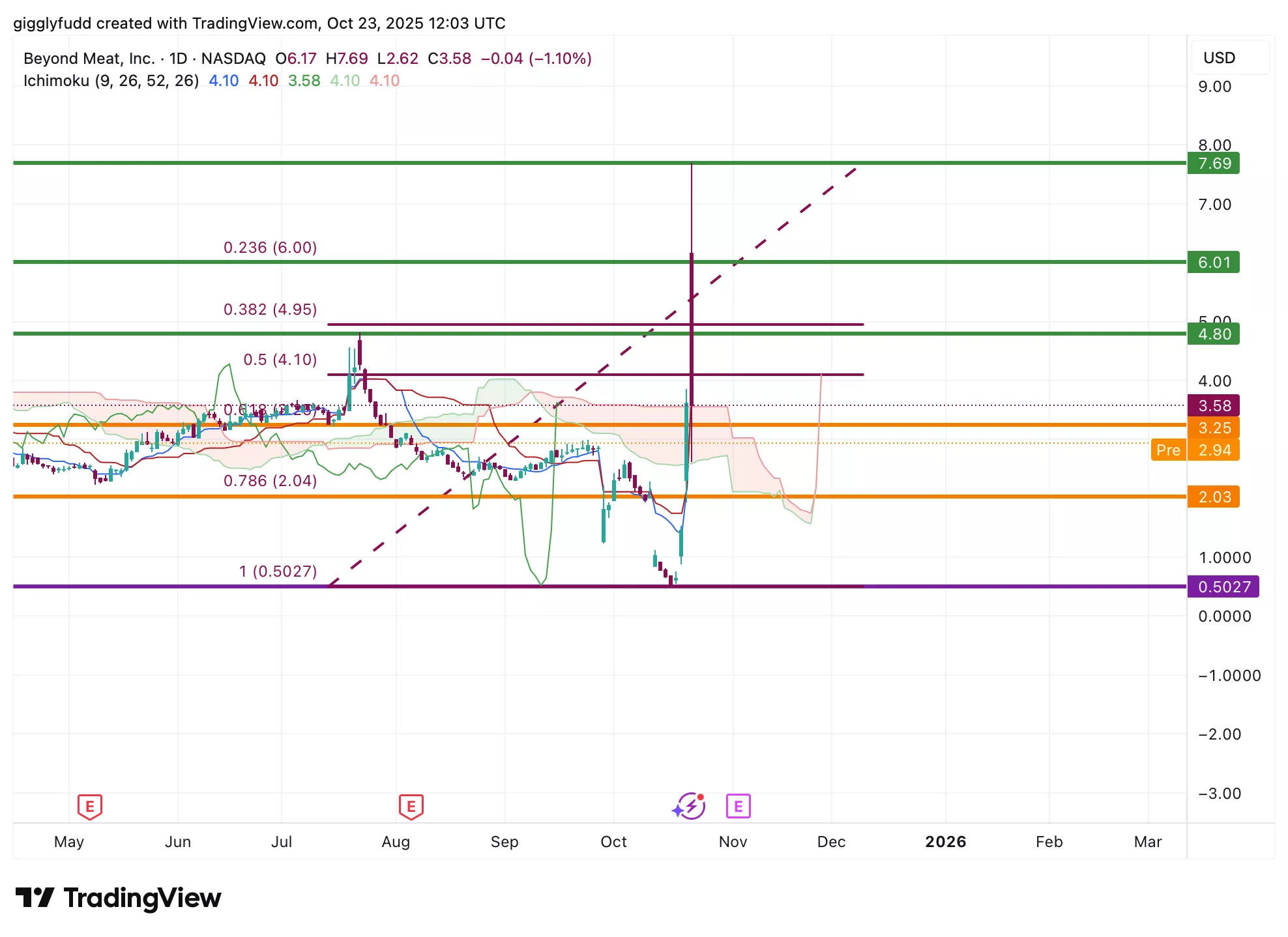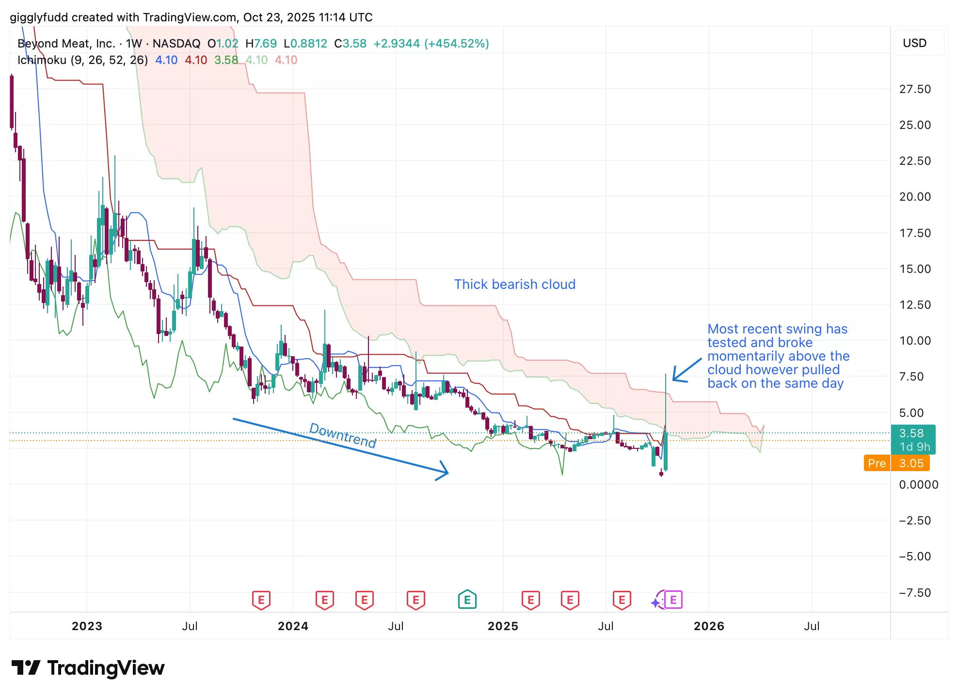 This rally also aligned with news of Beyond Meat’s $900 million debt-for-equity swap, which eased short-term bankruptcy fears but led to major share dilution. While the price temporarily broke above the Ichimoku cloud, it quickly pulled back, showing that resistance remains strong and the broader downtrend is still intact.