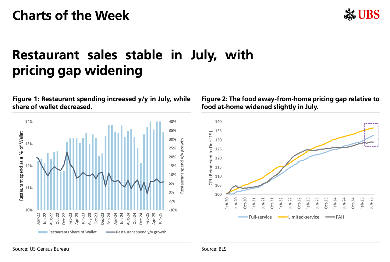 In a note to clients, UBS analyst Dennis Geiger highlighted the widening gap between food away from home and food at home; in other words, eating at home is getting much cheaper.