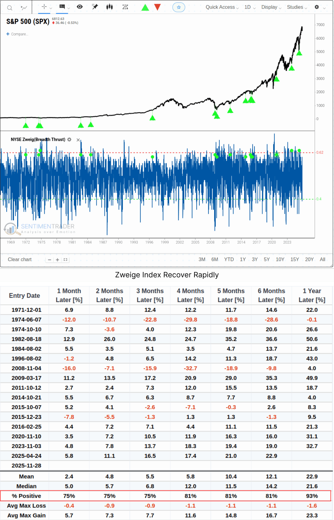 Yesterday, we discussed the Zweig Breadth Thrust, which in April of 2025 signaled the beginning of the monster rally. After the recent correction, as discussed yesterday, the sharp recovery of the indicator over the last 10 days is a bullish sign. As noted by Sentiment Trader yesterday: