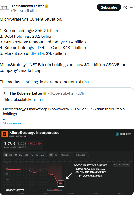 Strategy, formerly known as MicroStrategy, is a software company that holds significant Bitcoin holdings. In fact, the company would likely be bankrupt due to continued losses on its software products if not for Bitcoin. About six months ago, shareholders greatly rewarded the company for holding Bitcoin. Its market cap was about 1.5 times the value of its Bitcoin holdings. That premium has since collapsed. In fact, it is now negative. The negative premium might entice some investors as they can effectively buy Bitcoin at a discount. However, with Bitcoin comes corporate risk. The Kobeissi Letter (@KobeissiLetter) helps us break down the company’s balance sheet to assess its situation. Their take, which mirrors ours, is that the current discount reflects the market assigning a probability of default or other hardships to its shareholders.
