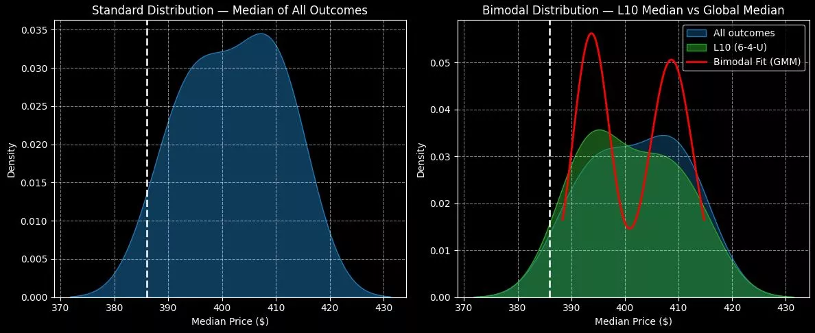 Currently, though, AVGO stock is structured in a 6-4-U formation: six up weeks, four down weeks, with an overall upward slope. Under this condition, the range of outcomes is about the same as the baseline state. However, price clustering would be expected to occur at around $393.