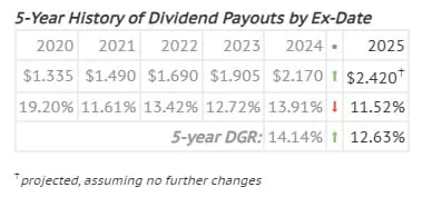 Broadcom's contribution to my portfolio's projected annual dividend income will increase by $15.60 to $169.