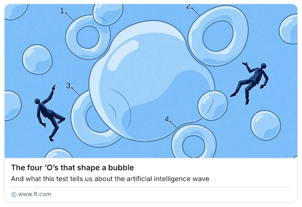 Ruchir Sharma writes, “The four ‘O’s that shape a bubble are overvaluation, over-ownership, over-investment and over-leverage… Tallying up, to varying degrees all four of the Os suggest AI is a bubble, and it has reached an advanced stage.”