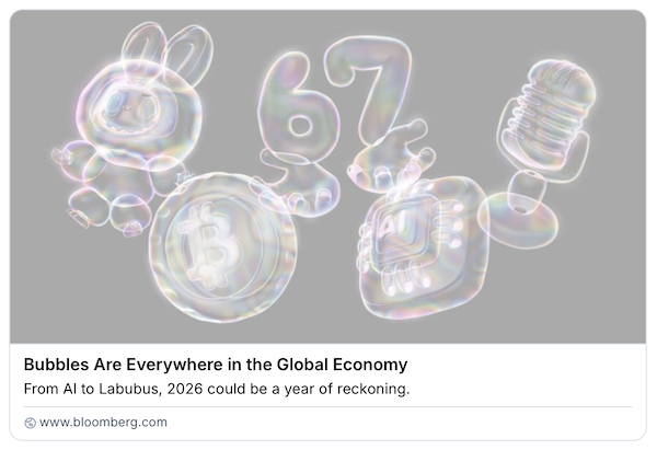 But it’s not just AI. “If you define a speculative bubble as any phenomenon where the worth of a certain asset rises unsustainably beyond a definable fundamental value, then bubbles are pretty much everywhere you look. And they seem to be inflating and deflating in lockstep,” reports Bloomberg.