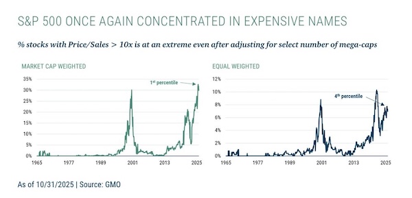 As to the extent of the overvalaution, GMO writes, “One striking sign of investor euphoria: more than 30% of U.S. market capitalization now trades above 10x sales, a level reminiscent of the tech bubble. History suggests such extremes rarely persist without painful corrections.”