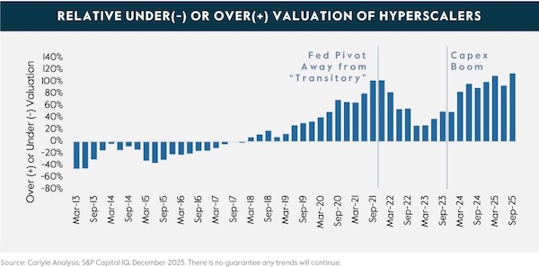 Carlyle quantifies this risk in noting, “If we assume that the PP&E on balance sheet should be valued at cost and assign a 10x P/B multiple to the rest, the hyperscalers’ market caps would be roughly half of what they are today.”