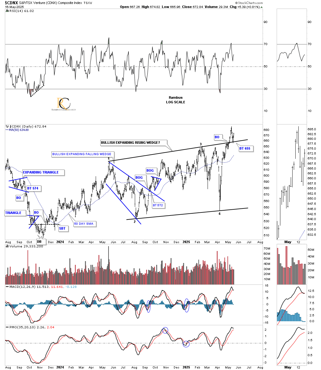In mid-April, the HUI formed a small micro topping pattern and began to consolidate the previous rally. Last Wednesday, the HUI strongly tested the bottom rail of the potential bullish expanding falling wedge, forming a possible small H&S bottom at the 4th reversal point. We should know early next week if the micro H&S bottom is valid. I will tweak the bottom trendline once the small H&S bottom is confirmed, which will show a slightly steeper lower trendline.