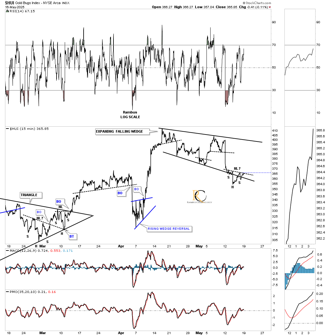 Next is a longer-term 2-hour chart, which shows how the expanding falling wedge on the 15-minute line chart above fits into the slightly larger picture. If you recall, I initially called the first reversal point a micro double top, and even though it’s very small, it was still a reversal pattern. Over the next month or so, the HUI has carved out the expanding falling wedge and is working on the all-important 4th reversal point.