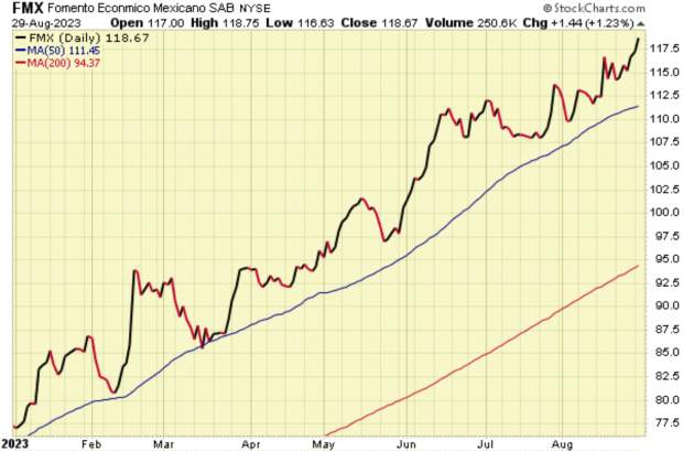 Notice how both the 50-day (blue line) and 200-day (red line) moving averages are sloping up. The stock has been making a series of higher highs. With both strong fundamentals and technicals, FMX is poised to continue its outperformance.