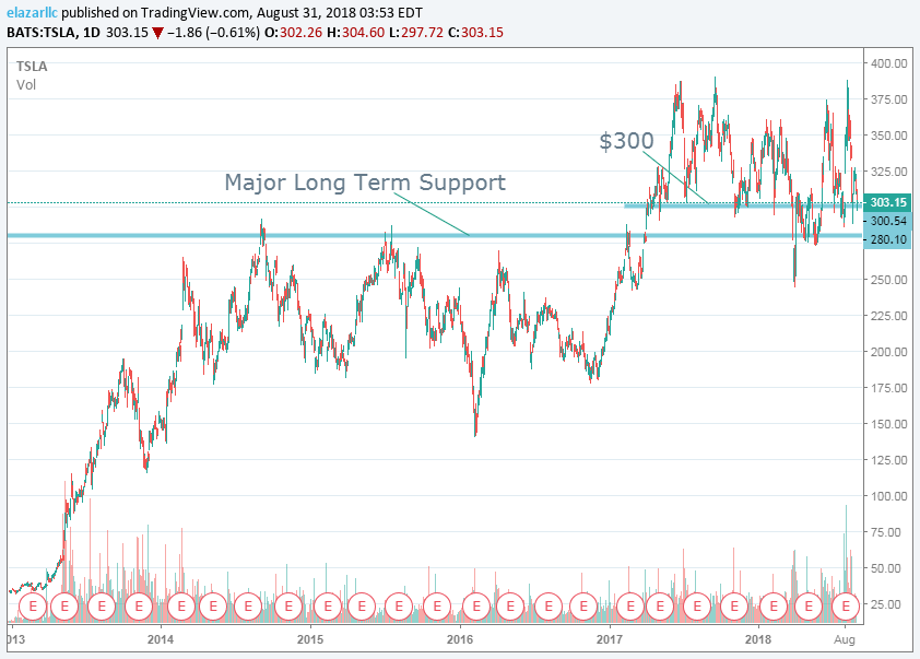 Tesla' stock held $300 yesterday but has been in a sharp downtrend since doubt surfaced about going private.