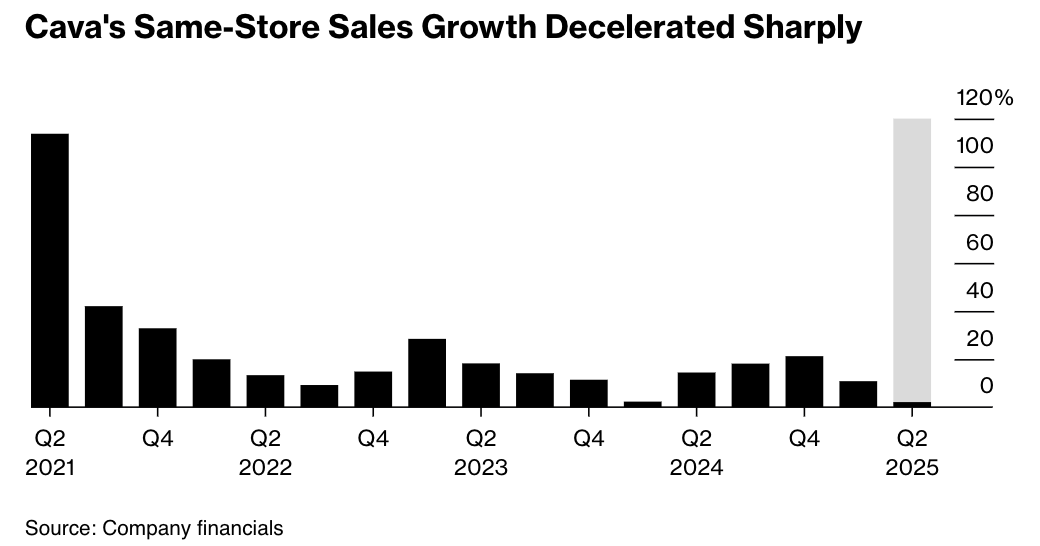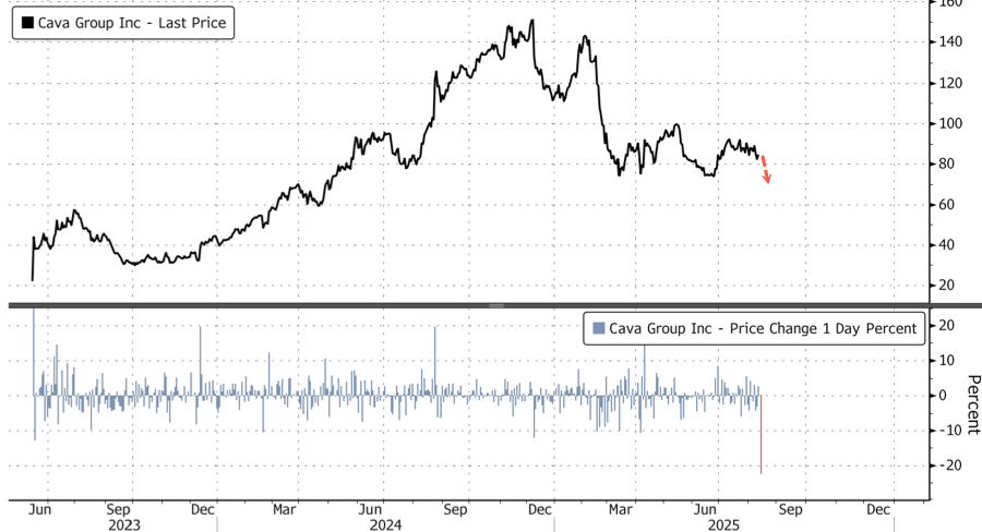 Shares of Cava Group (CAVA) crashed in premarket trading after the Mediterranean fast-casual restaurant chain slashed its full-year same-store sales growth forecast to a maximum of 6%, versus the previous estimate of 8%.
