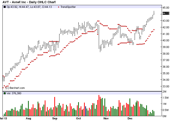 The Chart of the Day is Avnet (AVT). I found the stock by sorting the New High List for frequency in the last month and then eliminated those stocks that did not have positive gains for the last week and month. I then used the Flipchart feature to review the charts. Since the Trend Spotter signaled another buy on 12/10 the stock is up 5.08%.